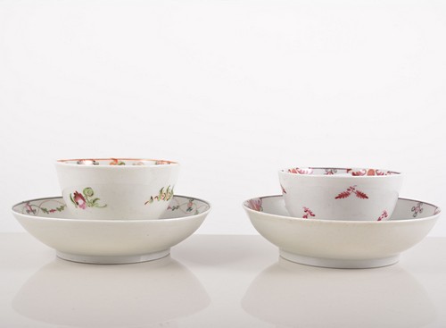 decorated with floral sprigs and pendant flowers and two other New Hall tea bowls and saucers, each with floral sprigs, festooning