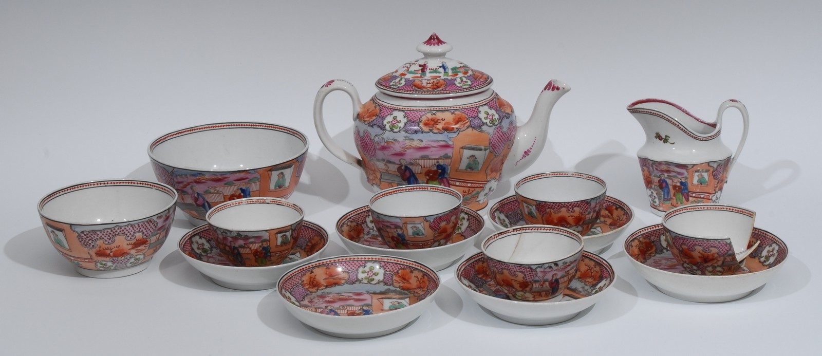 A Newhall Mandarin pattern teapot, milk jug, sugar, slop bowl, six tea bowls and saucers, printed and painted with colours, with figures and landscapes