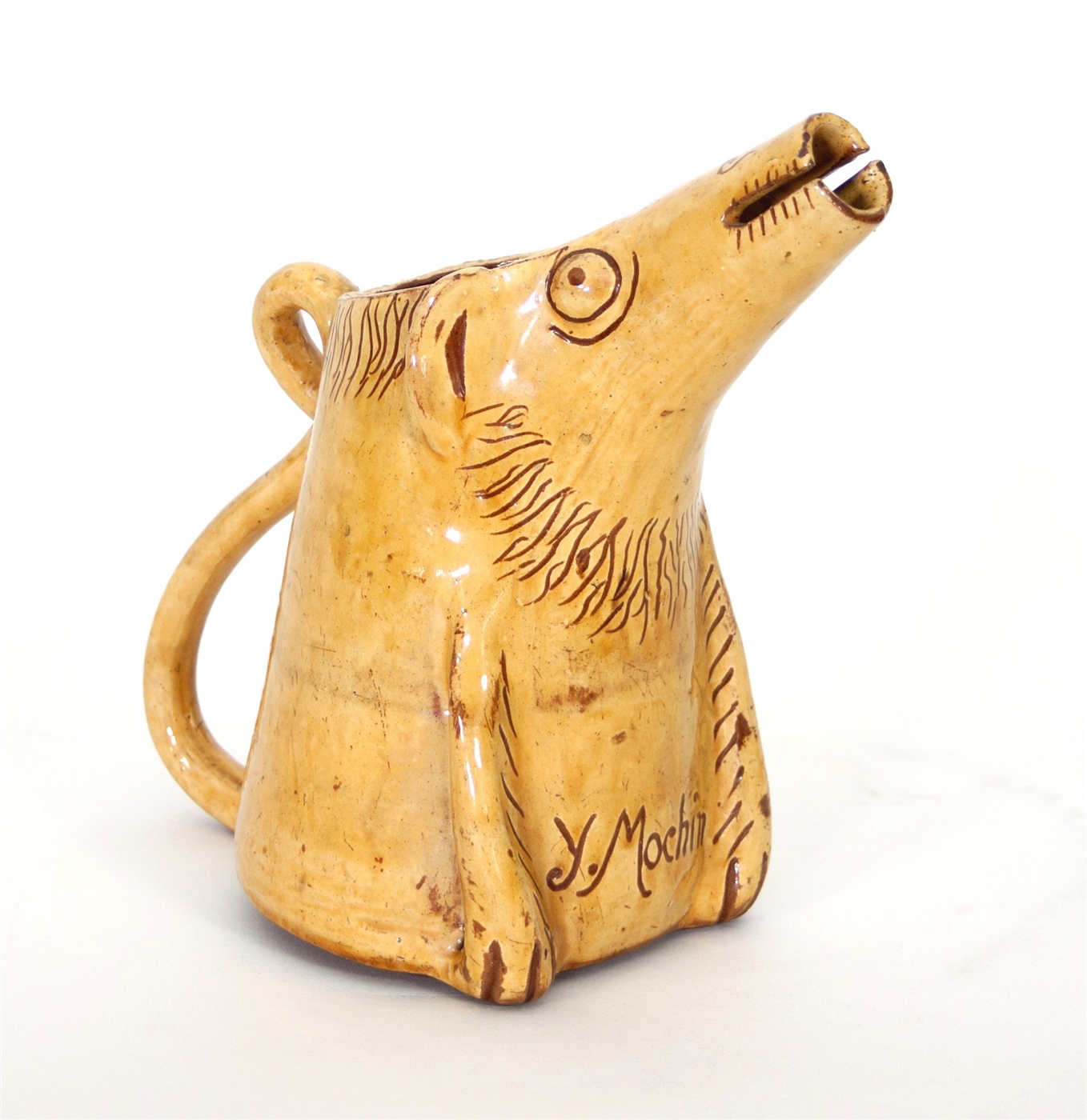 early 20th century, modelled with a zoomorphic conical spout, incised 'Y Mochin', glazed in ochre with sgraffito work