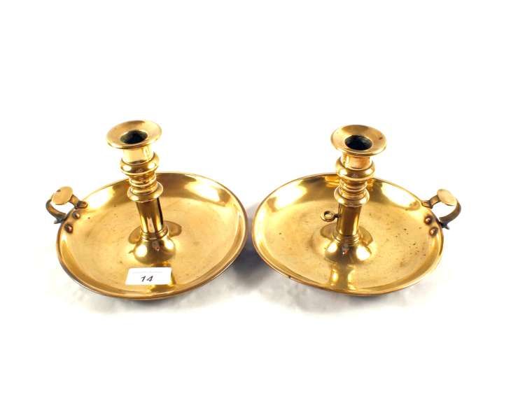 A pair of 19th Century Brass chambersticks with wide circular bases
