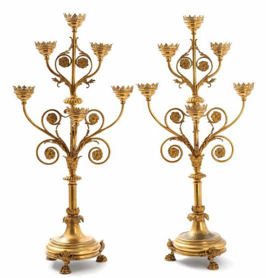 A pair of 19th century gilt bronze and brass altar candelabras