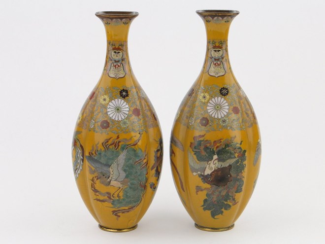 A pair of 19th century Japanese Cloisonne vases, with design of birds and flowers, 12''.