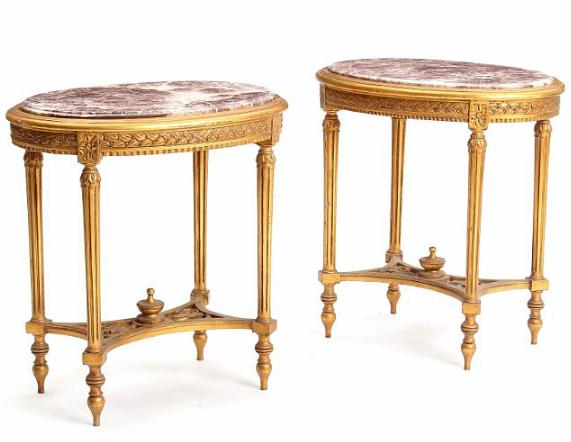 A pair of 20th century Louis XVI style gilded lamp tables, richly carved with foliage, reddish marble tops