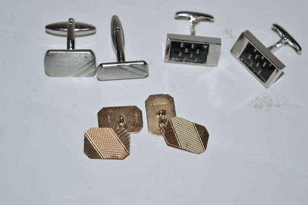 A pair of 9ct. yellow gold cufflinks, engine turned decoration, 4.8grms gross; together with two pairs of metal cufflinks.