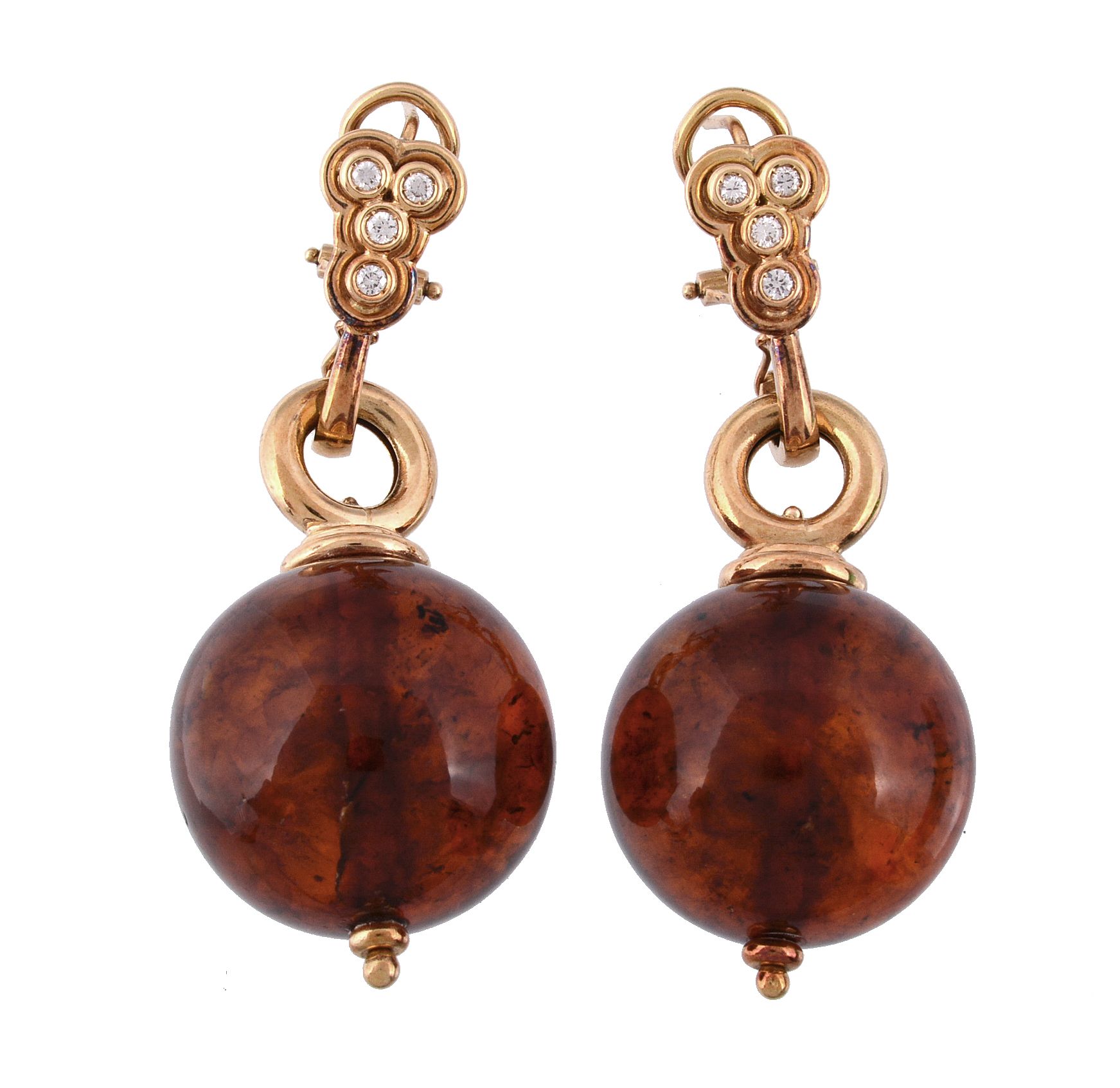the amber orbs suspended from a polished loop, set with brilliant cut diamonds in rub over settings, with post and clip fittings, stamped 750, 6.5cm long