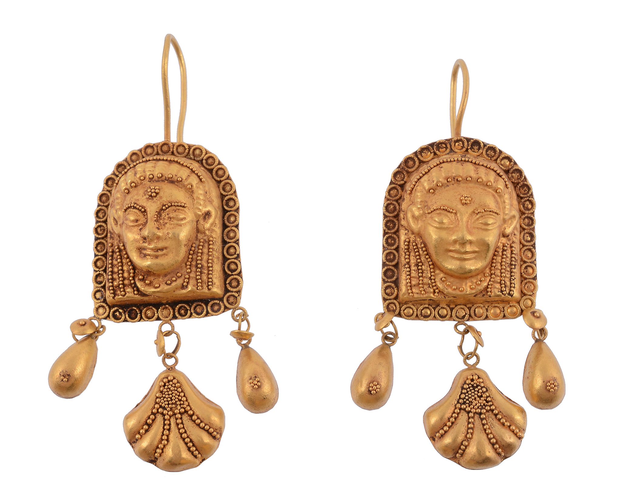 each panel with a relief of a face with granulated decoration with a border of applied circles, each suspending a central granulated scallop shell shaped drop with pear shaped drops either side, shepherd's hook fittings, 7.3cm long
