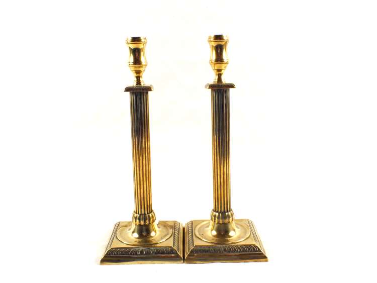 A pair of antique Brass candlesticks with fluted columns and gadrooned wide square bases