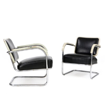 A pair of Art Deco tubular chromed steel and grey painted wood lounge chairs