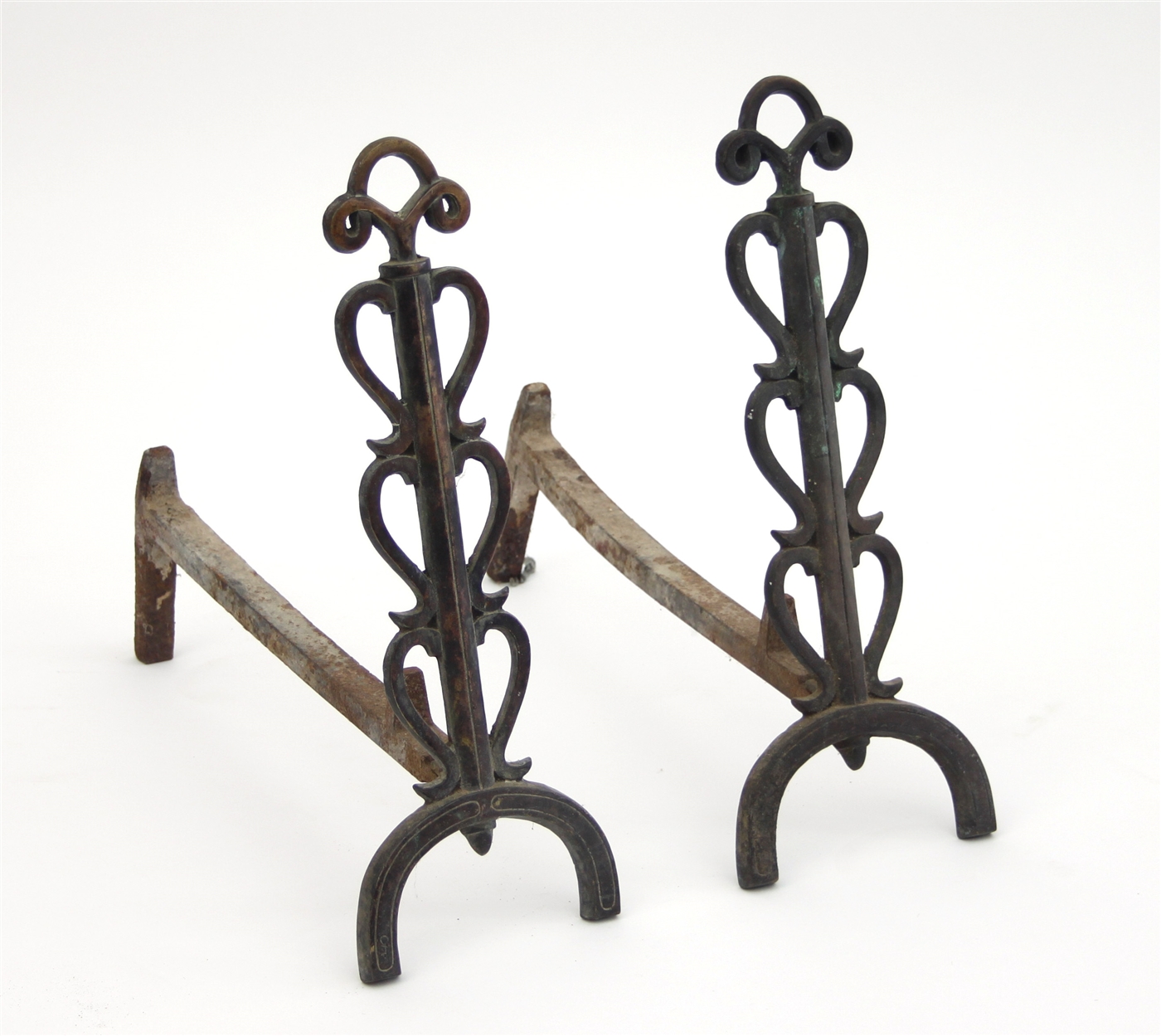 A pair of Arts and Crafts bronze andirons with stylised spandrels