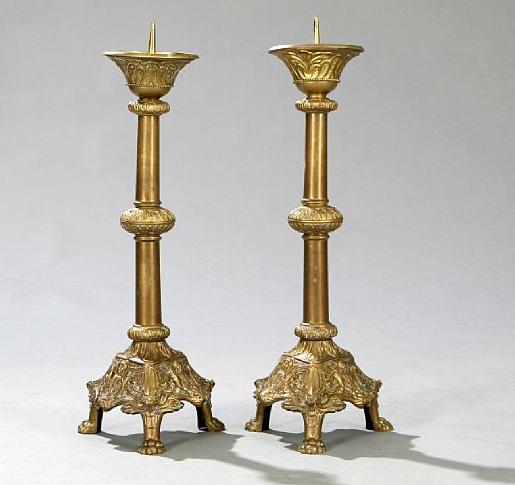 A pair of baroque style brass church candlesticks