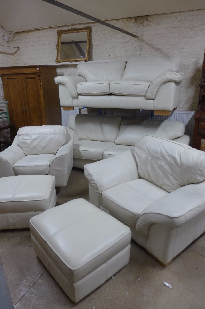 A pair of contemporary cream coloured leather sofas 200cm wide and a pair of matching armchairs