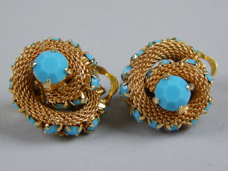 A pair of costume clip on earrings, with blue beads, gold plated