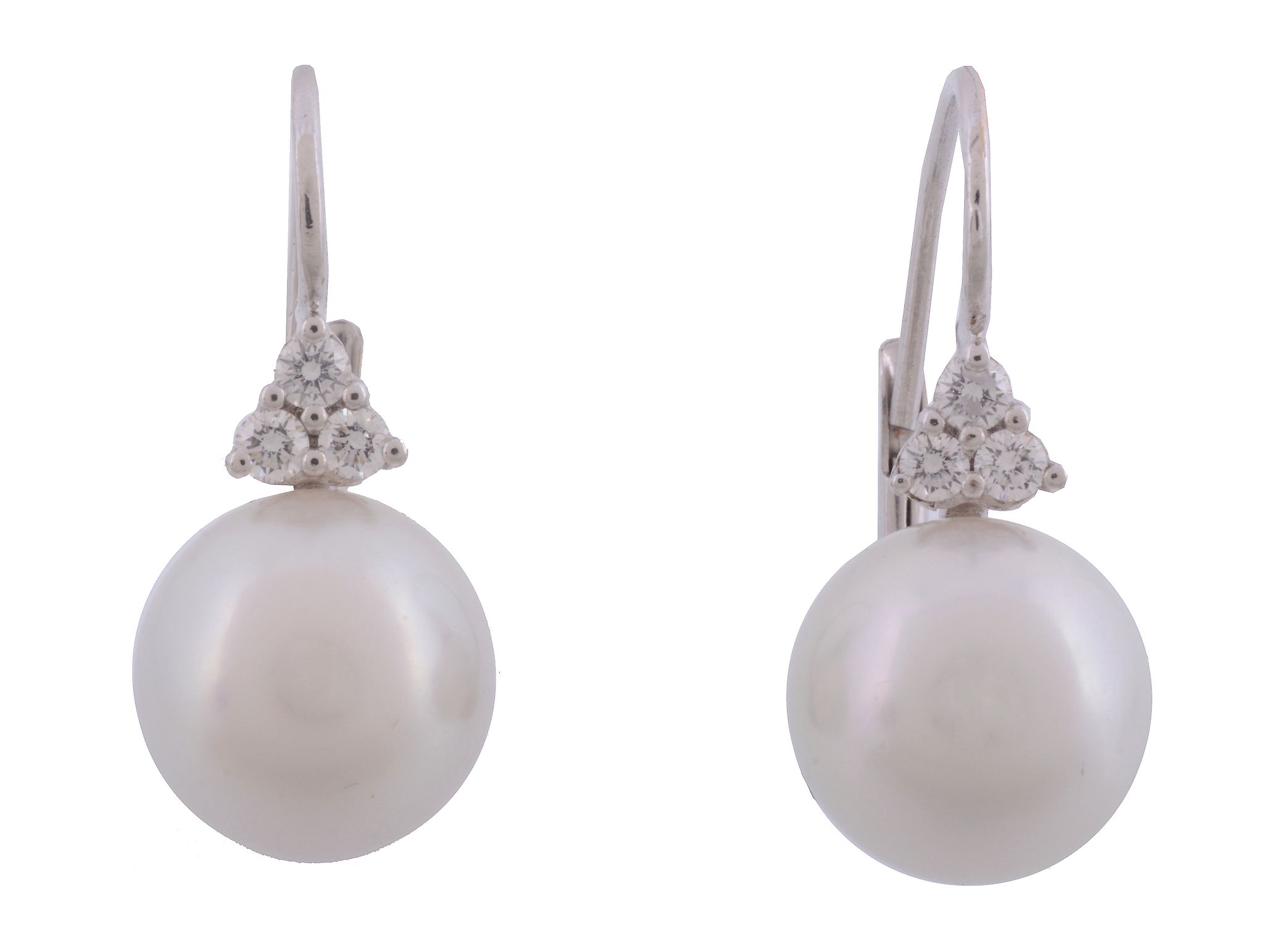 the cultured pearls measuring 12mm diameter, below three brilliant cut diamonds, stamped 750 with Italian control marks, 2.8cm long