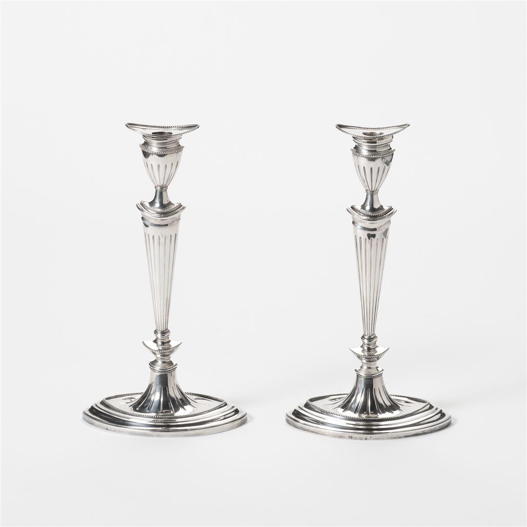 Mark of Pieter van Reidt, Amsterdam, 1796 Each on a navette-shaped base, the tapering stems supporting a vase-shaped socket with detachable drip-pans, with beaded borders. H. 31 cm Gross weight approx. 856 g (2x)