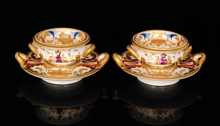 A pair of early 19th Century Derby twin handled table salts raised to matching twin handled stands, each decorated with enamel and gilt palmette and foliate scrolls, painted marks, stand diameter 10cm
