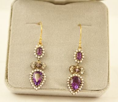A PAIR OF EDWARDIAN STYLE GOLD COLOURED METAL SET AMETHYST, DIAMOND AND SEED PEARL DROP EARRINGS, each having three shaped amethysts, bordered by seeds or diamonds, on wire fittings