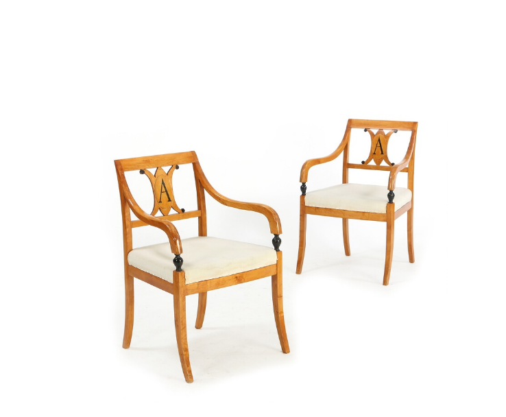 A pair of empire style birchwood armchairs