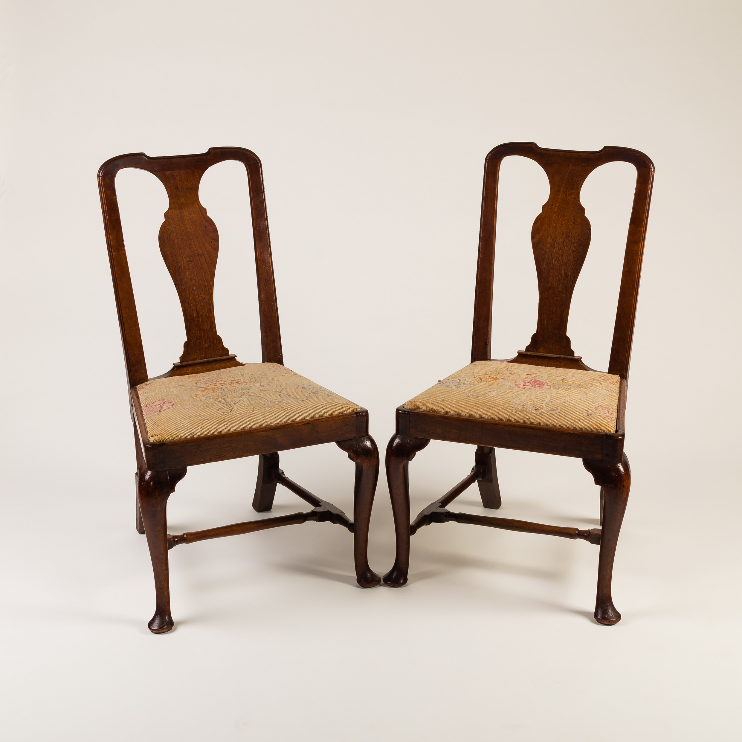 A pair of George I walnut side chairs, with vase shaped splats, drop-in seat and cabriole legs/see illustration