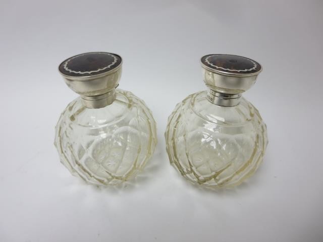 A pair of George V silver and tortoiseshell mounted glass Scent Bottles, Birmingham 1919
