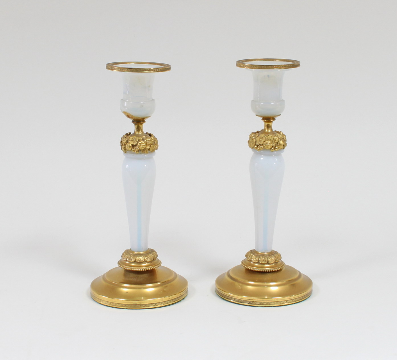 A pair of gilt metal mounted candlesticks, each with white opaque glass stems