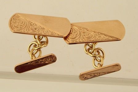 A PAIR OF GOLD COLOURED METAL CHAIN LINK CUFFLINKS, each having bright cut tooled pads, un-monogrammed, stamped 9ct