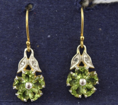 each with a floret of five heart shape peridots with small diamond set leaves above, on wire fittings