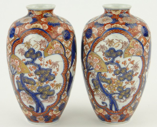 A pair of Imari porcelain vases, 7.25'' and a continental ink stand, (3).