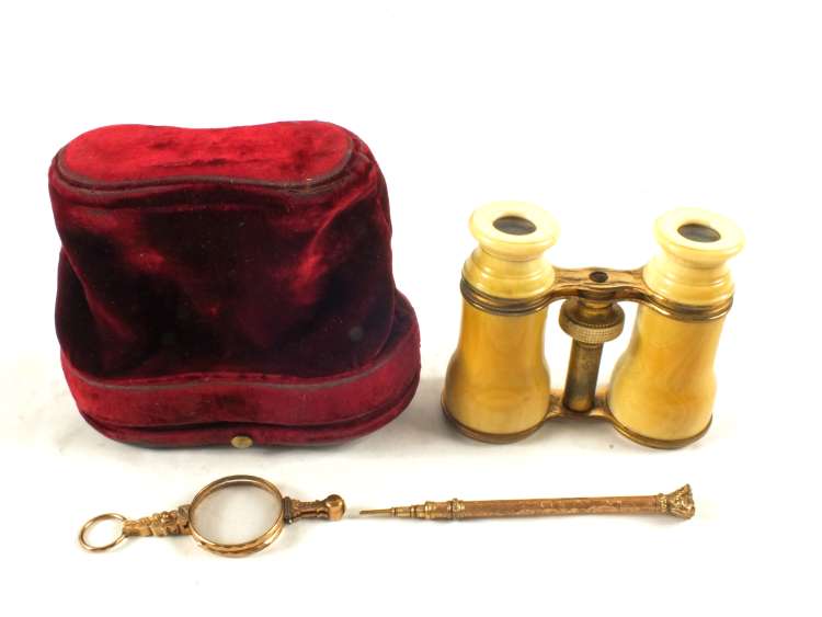 A pair of Ivory opera glasses, gilt metal Lorgnettes and a propelling pencil