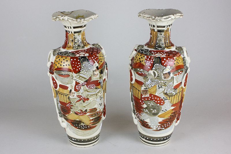 A pair of Japanese satsuma vases depicting warriors (a/f)