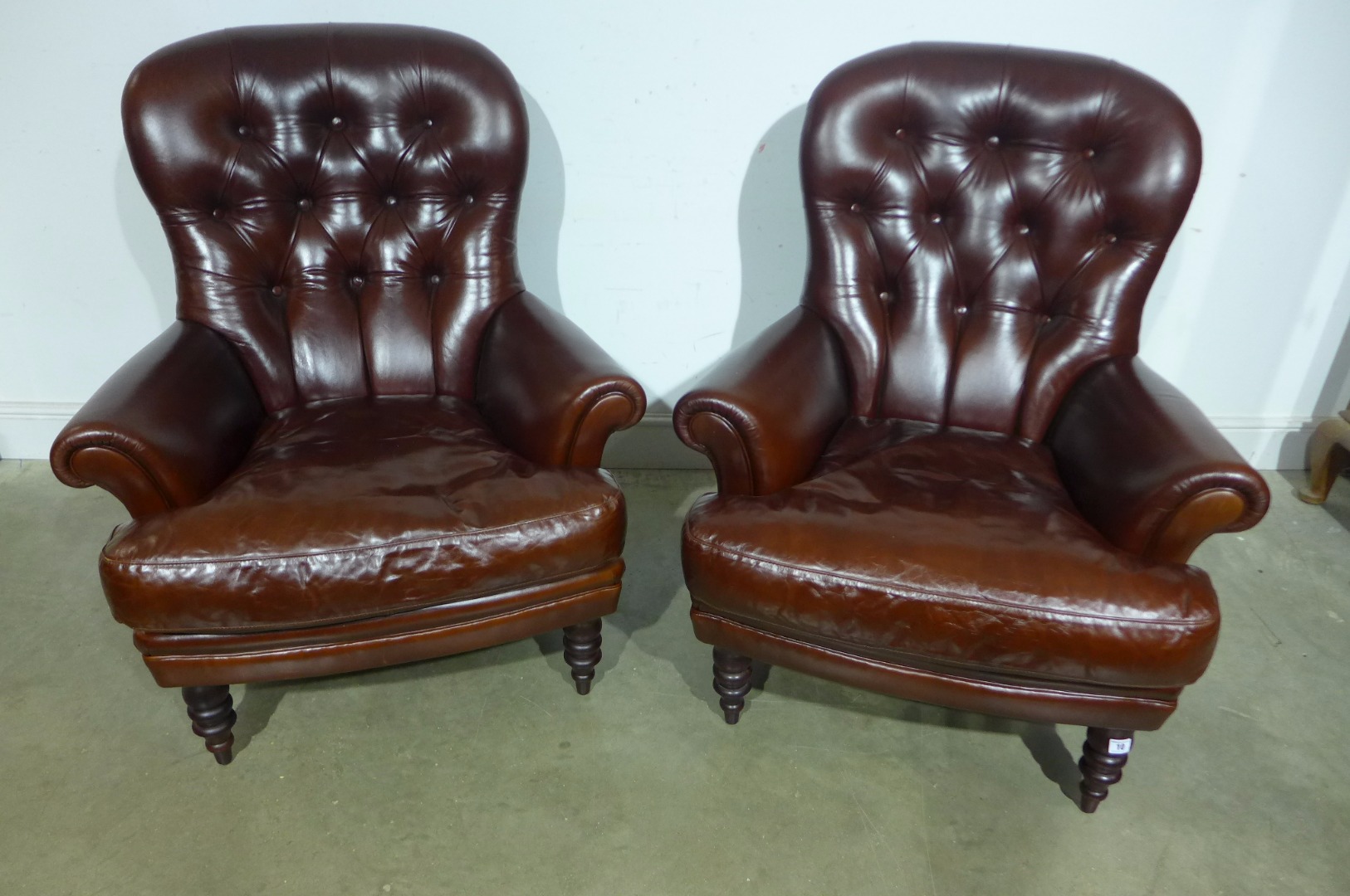 A pair of John Lewis brown leather button back armchairs on turned legs in as new condition retailing for over £1000 each