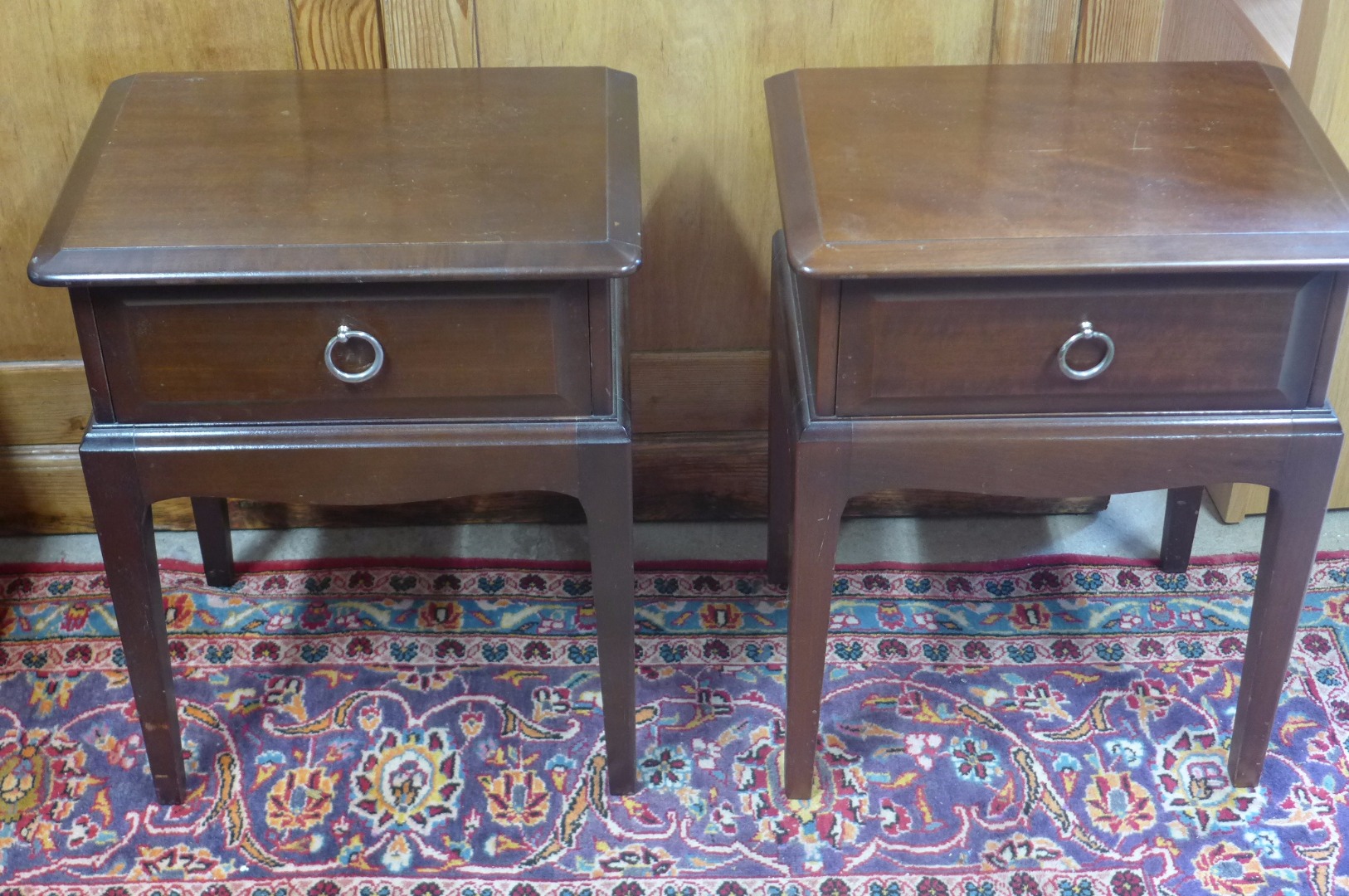 A pair of mahogany stag bedside tables with frieze drawers, metal drop handles on square tapering legs