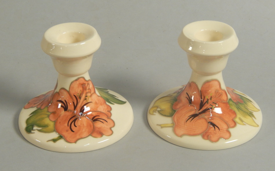 A pair of Moorcroft Hibiscus pattern short candlesticks