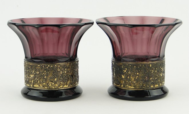 A pair of Moser purple glass vases with bacchanalian friezes, 3.75''.