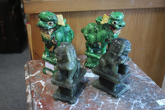 A PAIR OF ORIENTAL JADEITE DOGS OF FO, 16cm high together with a pair of green glazed oriental pottery dogs of fo, 20cm high (4)