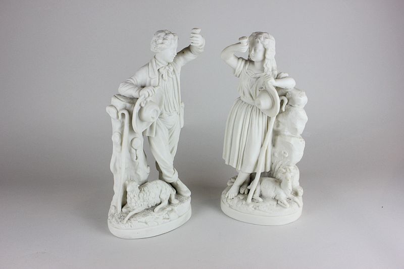 A pair of Parian figures of a shepherd and goatherd, the boy and girl both raising a flower and holding a hat, 31cm high