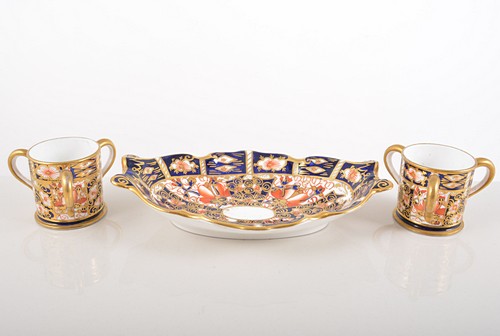 date ciphers for 1908-09, Imari pattern no. 2451, 4cm, two similar Imari pattern sweetmeat comports, each with double handles, width 16cm and an Imari pattern oval sweetmeat dish