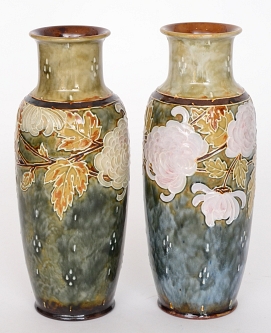 A pair of Royal Doulton stoneware vases each decorated with tubelined pink chrysanthemum flowers and foliage to a mottled green blue ground with tubelined trailing, impressed marks, height 30.5cm
