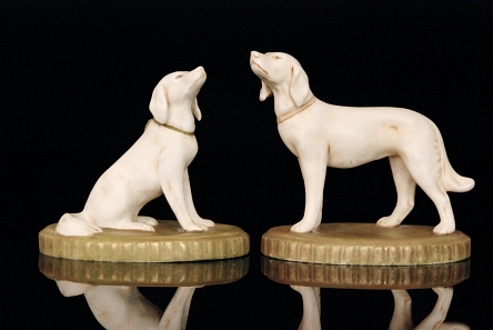 A pair of Royal Dux models of golden retrievers, each stood to a matt green and gold oval base, printed marks, applied pink triangle, height 12cm