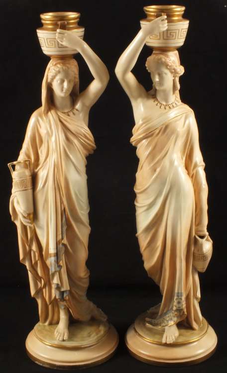 A pair of Royal Worcester blush ivory figures of ladies with Grecian urns
