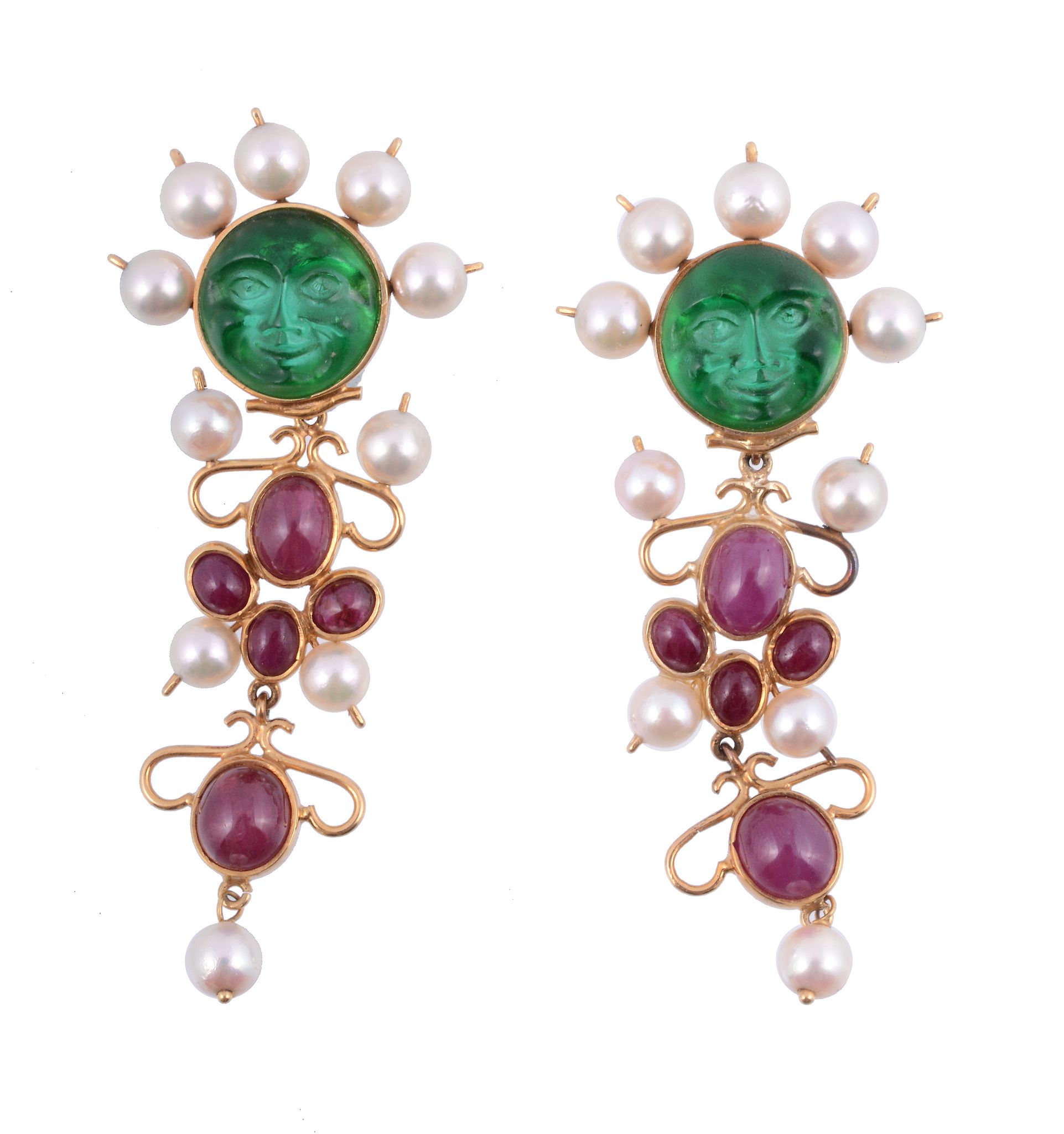 pediments set with pressed green paste faces, suspending cultured pearl and oval cabochon set drops, stamped 750, 7.7cm long