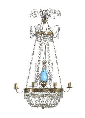 A pair of Russian crystal, gilt brass and bronze four light chandeliers