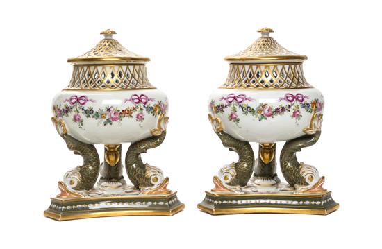 each with a reticulated lid and neck, the festoon decorated bottle raised on a tripartite dolphin form base, with interlaced Ls mark centered with a T.