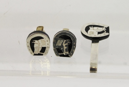 A PAIR OF SILVER MOUNTED CUFF LINKS AND MATCHING TIE PIN