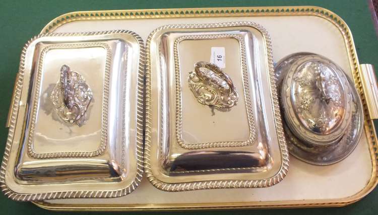 A pair of Silver plated entree dishes and a Silver plated butter dish with cow mount