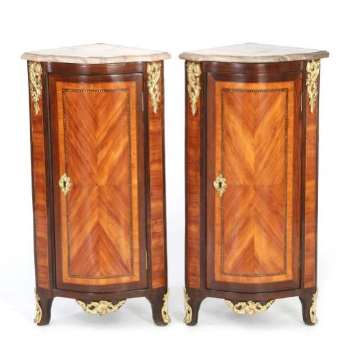 A pair of small Louis XV rosewood and walnut corner cupboards