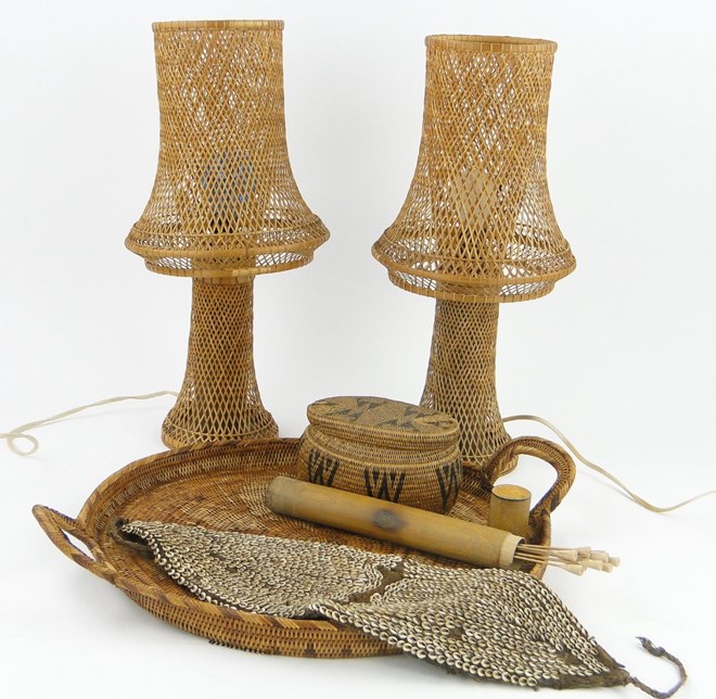 A pair of South Pacific cane work table lamps, shell decorated belt, darts, etc.