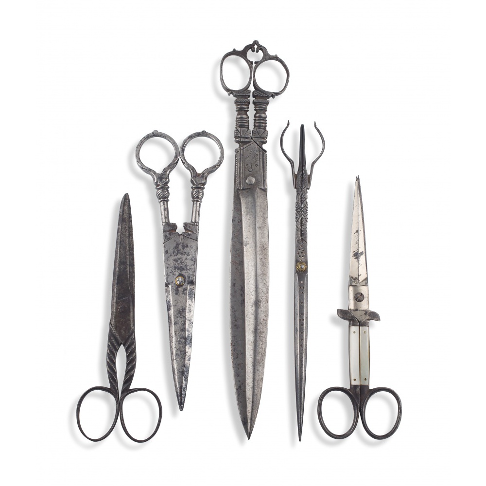 24,5cm long; a pair of Persian steel calligrapher's scissors, 19th century, 19,7cm long; a pair of mother-of-pearl and steel dagger-shaped scissors, late 19th/early 20th century, 16cm long; a pair of steel scissors, late 18th century, 17cm long; and