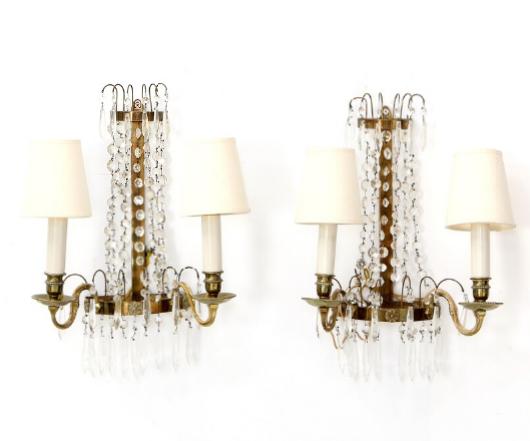 A pair of Swedish brass and cut glass sconces