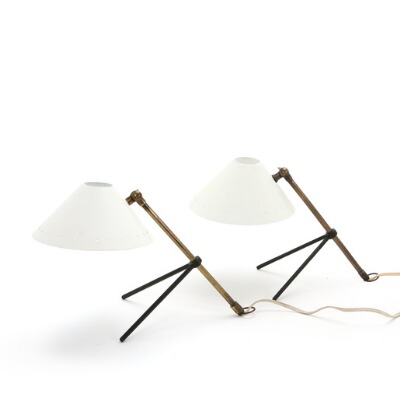 A pair of table lamps with frame of brass and black lacquered metal, shades of white lacquered metal