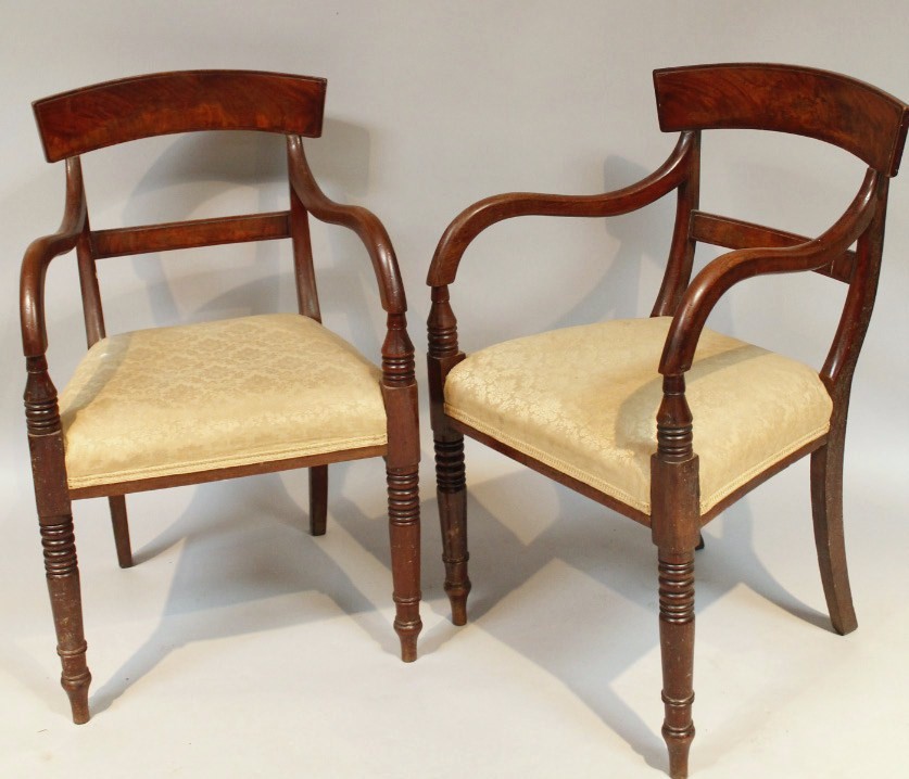 each with curved back rails and splats above carved serpentine arm rests and drop in seats, in gilt floral material on turned cylindrical front supports